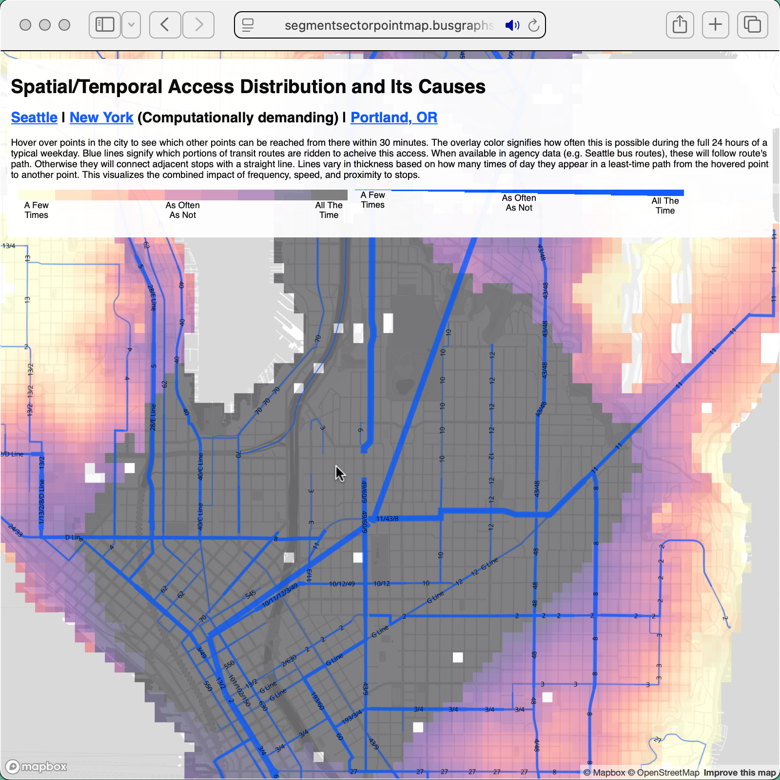 This map expands on the prototype by displaying the transit service used to achieve the access. Segments of routes vary in thickness based on how many times of day riding that segment comprises part of at least one fastest-possible trip to any destination. Thicker lines are more likely to be useful for reaching arbitrary destinations, thin lines will rarely be used. I envision this feature as a way to facilitate conversations about transit network redesigns between transit agencies and riders. A proposal to cut parts of a route may be unpopular to those living in its vicinity. This map can help those in the neighborhood and those at the agency find common ground on whether the route segment is in fact critical for getting around.