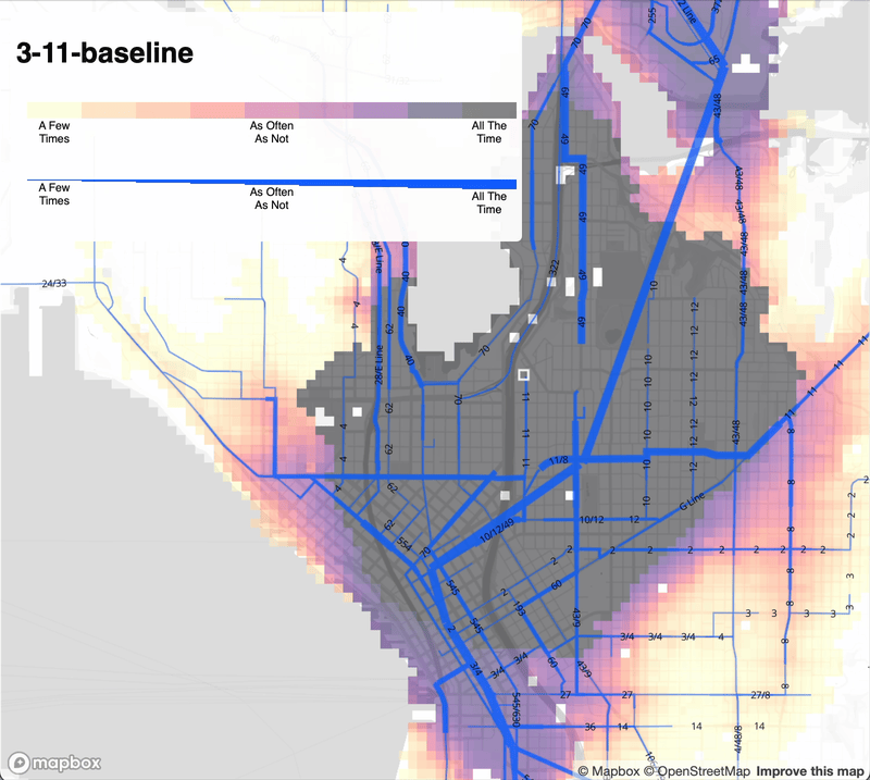 In theory, the saved time could be reinvested in new service, improving access further without an increase in King County Metro’s costs. It may be possible to boost route 11 from 20-minute to 15-minute headways most of the day, meeting Metro’s definition of frequent service. Alternatively, extending route 11 to Eastlake would provide a new east-west transit connection in Seattle. In practice, whether these investments are feasible is more complicated. Agencies incur expenses whenever a driver is working, even if their vehicle is not serving passengers. Schedules that specify blocks, collections of trips that are served by the same vehicle, account for at least the layover component of this out-of-service time. Grouping modified trips into new blocks, and measuring the duration of all blocks for the original and modified networks, would provide more insight into whether hypothetical changes are feasible.