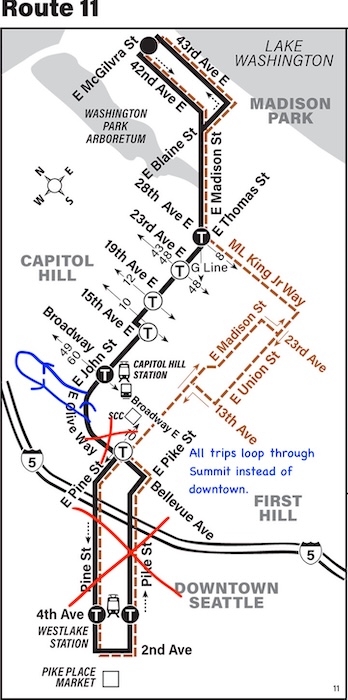 The following illustrates how arf can be used to make changes to a network, then describe the access implications. I will modify two King County Metro routes serving Seattle, routes 3 and 11. Route 3 goes from Madrona, through Downtown Seattle, to the Summit area of Capitol Hill. Route 11 travels from Madison Park to Downtown Seattle via Capitol Hill. I want to see if connecting Summit to the Capitol Hill Link light rail station is better for access than Summit’s present connection to downtown via route 3. To do this, I’ll send route 11 to Summit instead of downtown. This will also boost Summit’s frequency and span of service. Riders who use the portion of route 11 between Capitol Hill Station and downtown will have to transfer, but have a fast and frequent option in the Link.