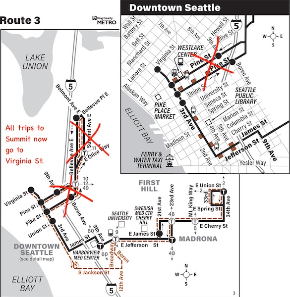 For route 3, T2 and T5 already represent the desired endpoint of running from downtown to Madrona, and vice versa. T1, T3, and T4 must be changed to skip Summit and instead follow the paths of T2 and T5.
